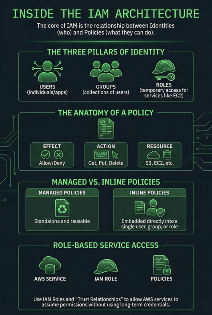 IAM mimarisini anlamak için dört temel yapı taşını bilmek gerekir: Kullanıcılar, Gruplar, Roller ve Politikalar.